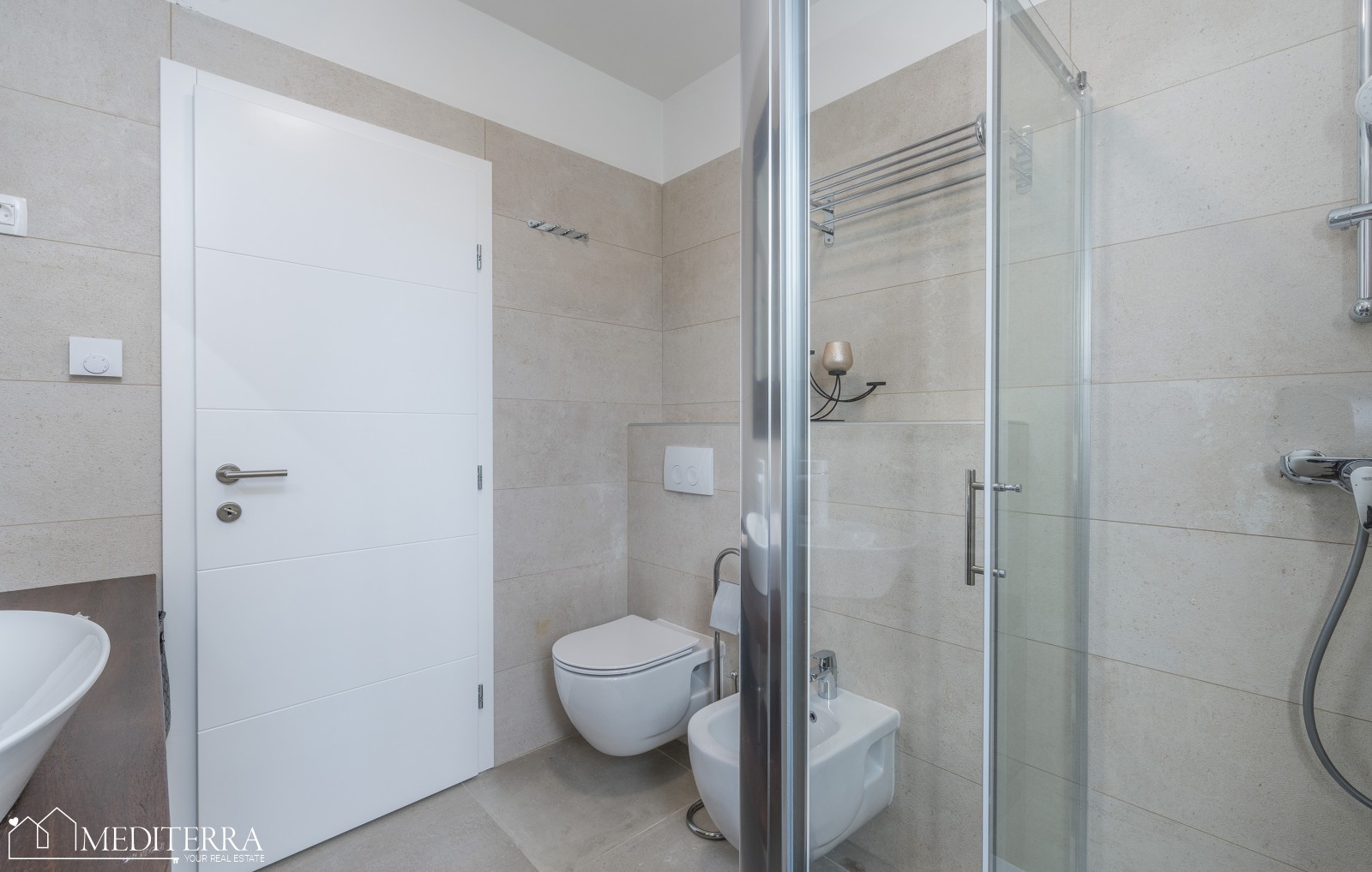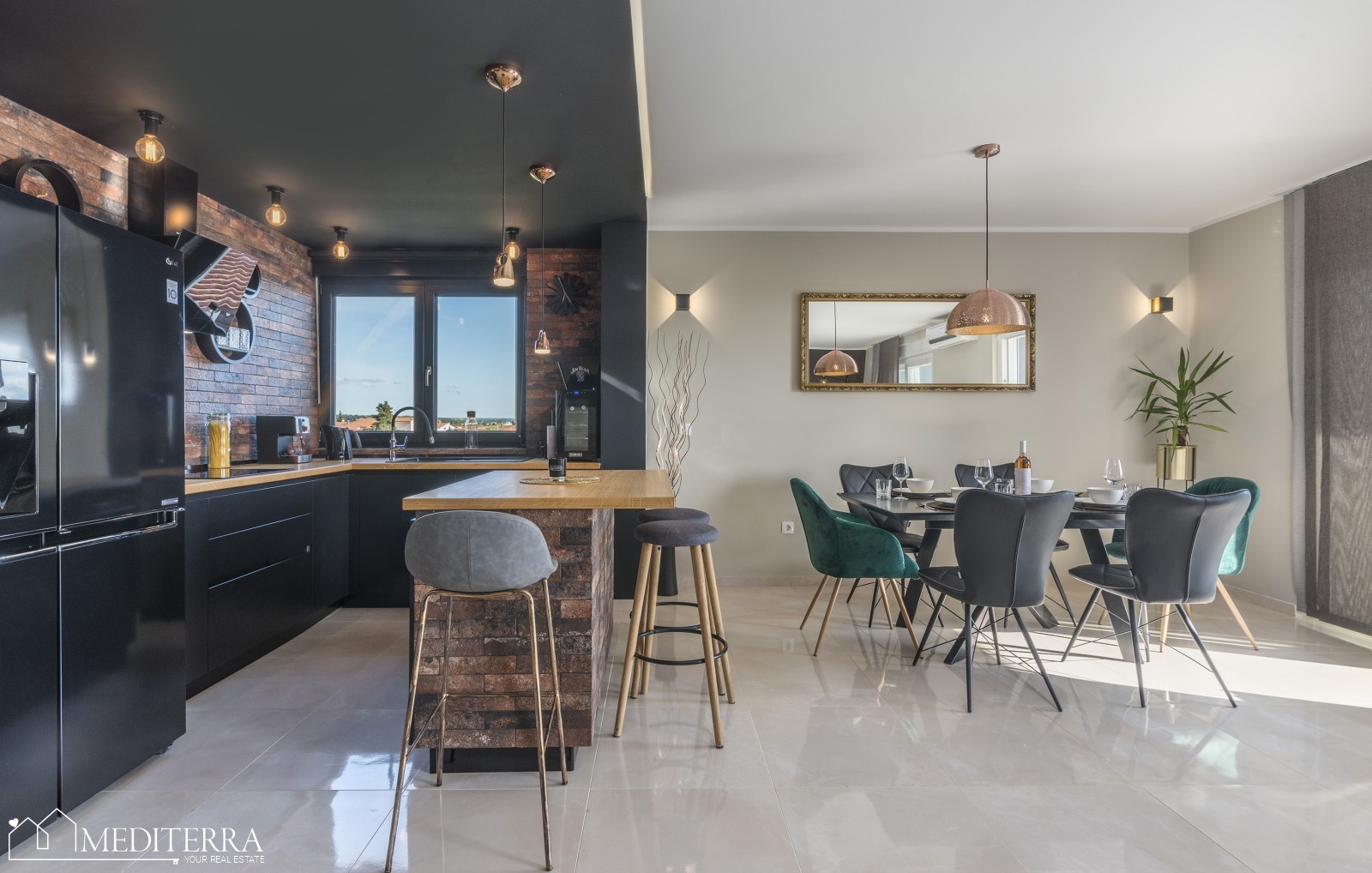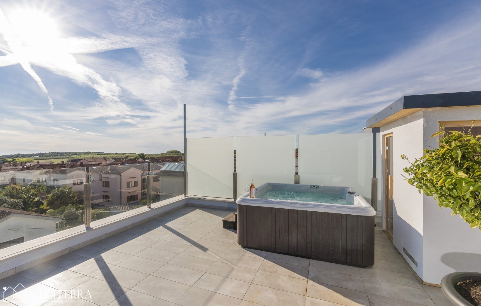 Stanovanje se nahaja na odlični lokaciji, le 400 metrov od najlepše novigradske plaže. Stanovanje se nahaja v drugem nadstropju stanovanjske stavbe in je sestavljeno iz predsobe, kuhinje, jedilnice in dnevne sobe, treh spalnic, treh kopalnic in savne i jacuzzi. Stanovanje ima dve pokriti terasi ter zasebni izhod na 51 m2 veliko strešno teraso. Stanovanju pripadata tudi dve parkirni mesti. Vsaka soba ima klimatsko napravo za hlajenje in talno ogrevanje po celotnem stanovanju s toplotno črpalko.